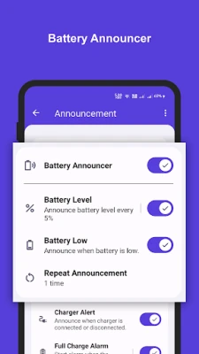 Battery Announcer lightweight app that notifies the user at user-defined battery levels. With the help of this app, you can know about your battery level without looking at your mobile.