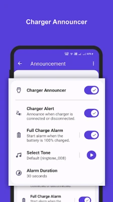 Charger Announcer announces when the charger is connected or disconnected and also notifies when the battery is fully charged.