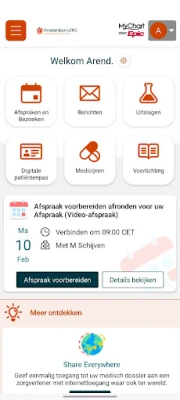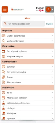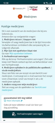 In de app Mijn Dossier Amsterdam UMC kunt u: • persoonlijke gegevens beheren • afspraken beheren en voorbereiden • berichten bekijken en versturen van en aan uw zorgverleners • uitslagen bekijken • medicijnen en allergieën invullen • herhaalrecepten aanvragen • vragenlijsten invullen • gegevens invullen bij thuismeting