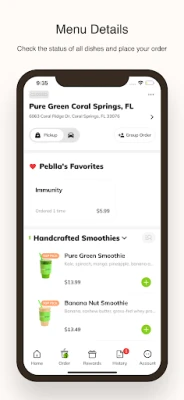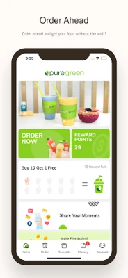 Order ahead and get your food without the wait! Menu Details Check the status of all dishes and place your order. My Orders Track your Orders and get real-time notifications your order is ready! Gallery Snap and Share your Pure Green Moments with others. My Account Check your Reward Balance, Order History and more.